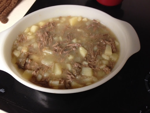 Cook beef in an ample supply of water in an electric skillet. As is it cooks, keep removing the fat scum as it rises. When done, remove meat, dice the potatoes and onion, add salt and cook in meat broth until done. While potatoes/onions are cooking, shred the roast with a fork) When the potato mixture is done, add meat and simmer until hot. If it needs thickening, add a small amount of flour with water to thicken. Serve with fried cornbread.