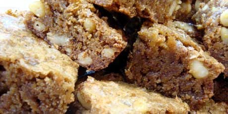 3. In a separate bowl, whisk the dry ingredients together. Combine the flour, baking powder and salt. Add to the wet and stir the batter until smooth. Stir in the nuts and candy bits and pour into the prepared baking pan. Bake 45 minutes. Cool for a few minutes before cutting into squares.