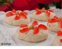 Shape the dough into 1-inch balls and place on ungreased baking sheets. Flatten each ball and place a butterscotch chip in the center of each. Arrange 5 cherry slices in a circular pattern around each butterscotch chip to resemble the pattern of a poinsettia.