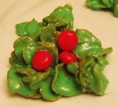 Melt marshmallows & margarine. Add 1 tsp vanilla and drops of food coloring. Fold in 3 1/2 c. corn flakes. Drop by teaspoon onto wax paper (or shape into wreaths for wreath cookies). Decorate with cinnamon hearts or Christmas sprinkles.