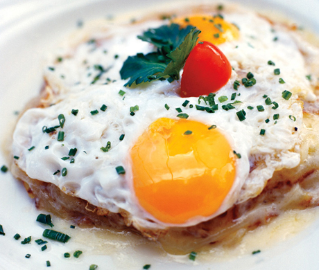 Cut rösti into quarters, top with eggs, and garnish with parsley.