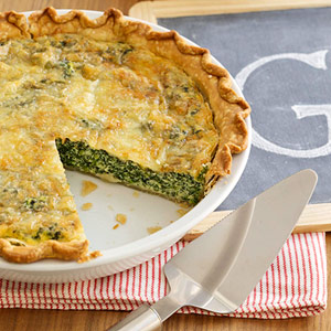 2. In a medium-size bowl, whisk together the eggs, milk, salt and pepper. Spread the spinach into the bottom of the prepared pie crust. Pour egg mixture evenly over spinach, then sprinkle with the cheese.