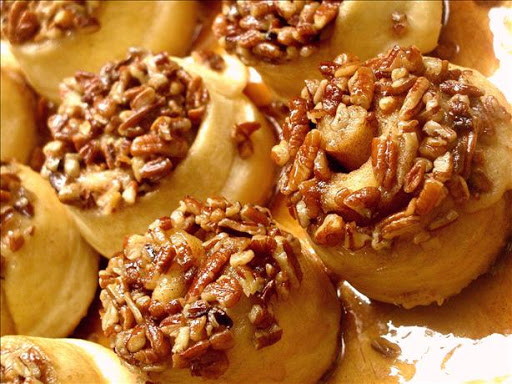 Place roasting pan or baking sheet on top and turn the whole thing the other way up. Remove the muffin tray and dislodge any nuts that are still stuck in it, adding them, along with any residual syrup, to the upturned buns.