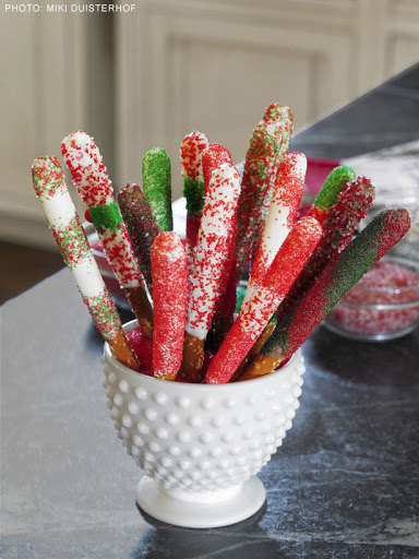 Dip one pretzel rod into the milk chocolate; use a spoon or butter knife to spread the chocolate about halfway up the rod. Twist the rod to let the excess chocolate drip off. Hold the rod over a piece of wax paper and shake sprinkles on all sides. Place the pretzel on another piece of wax paper to dry. Coat another pretzel with white chocolate and sprinkles. Repeat until you've coated all the pretzels, half with milk chocolate, half with white chocolate, and let dry completely, about 24 hours. (Cover any remaining chocolate with plastic wrap and store in the refrigerator.)
