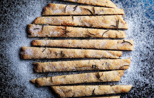 Using an electric mixer on medium-high speed, beat butter, granulated sugar, powdered sugar, and salt until very light and fluffy, 7–10 minutes (beating air into butter makes for tender shortbread). Reduce speed to low and add flour, caraway, and 2 tsp. chopped rosemary; mix just to combine. Dough will look shaggy and a little dry (it’s not!).