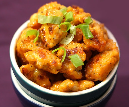 Bread the chicken cubes by first coating it in the bread mixture then the egg wash then back in the breading. Put the coated chicken cubes on a plate. Continue until all the chicken have been breaded.