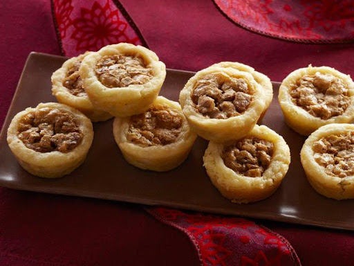 Shape the chilled dough into 24 balls, about 1 inch in diameter. Press each ball into a cup of the muffin pan, spreading evenly and up the sides, then spoon 1 teaspoon of the pecans into each muffin cup. Fill each cup with the egg mixture until evenly distributed, about 1 teaspoon in each. Bake until the filling is set, about 25 minutes. Cool on a wire rack for 10 minutes, and then remove from the muffin pan.