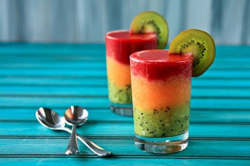 Combine the peeled kiwi and lime juice in the clean basin of a food processor or blender. Pulse or blend until pureed. Set aside. Add the cantaloupe in the clean basin of a food processor or blender. Pulse or blend until pureed. Set aside. To layer gazpacho, gently spoon equal amounts of kiwi puree into each of four bowls or glasses. Repeat with cantaloupe puree and raspberry puree. Garnish with kiwi slices.