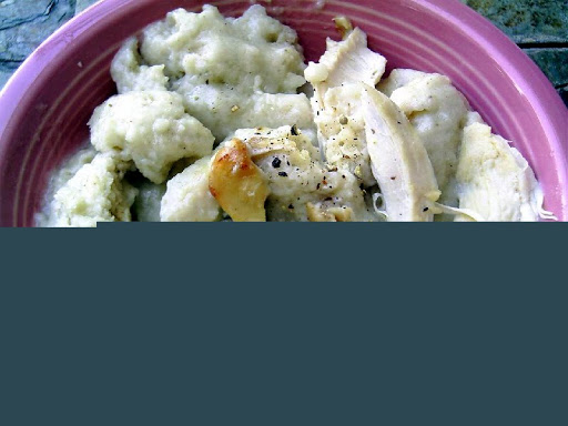 3. Strain broth and bring to a boil on stove top. Spoon in tablespoon-sized portions of dumpling dough, one at a time. Cover with lid and lower heat to a simmer.