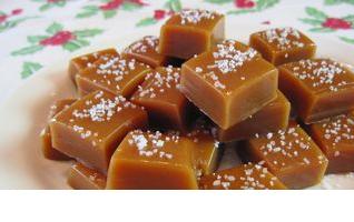 Spray a large cutting board with non-stick vegetable spray. Lifting caramels by the edges of paper, turn caramels onto cutting board. Use a sharp knife to loosen paper; peel off paper. Cut into 1-1/2" x 1" pieces. Wrap each piece in paper. Caramels may be stored up to one month in airtight containers.