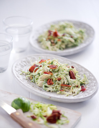 Wash and trim edges of brussels sprouts. Slice brussels sprouts very thin.