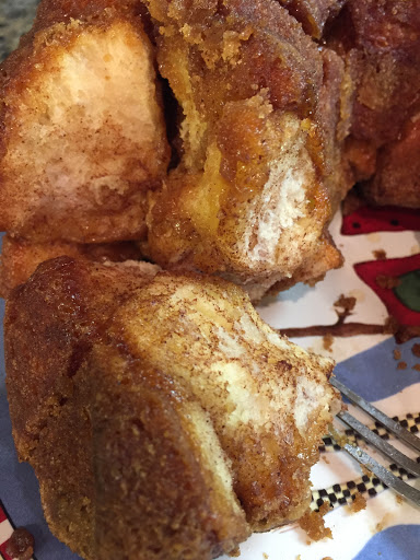 2. Mix white sugar, cinnamon and nutmeg in 1-gallon plastic bag or a large Tupperware bowl with tight fitting lid. Cut each biscuit into quarters. Shake quarters in bag or bowl to coat; place in pan.