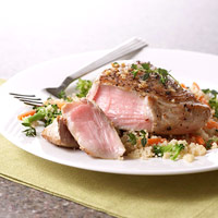 - 4 fresh or frozen tuna steaks, cut 1-inch thick (about 1 pound)