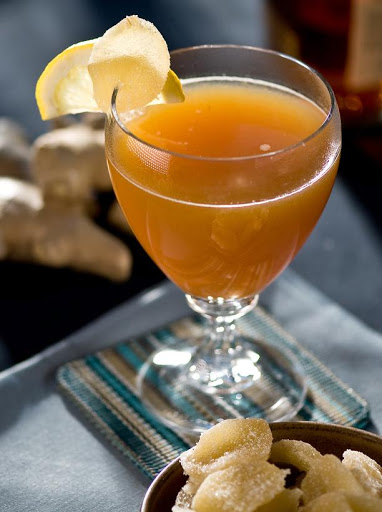 Heat the ginger-infused cider, but do not boil. Add bourbon. Stir in honey. Pour into a coffee mug. Garnish with lemon and ginger slice (or use crystallized ginger).