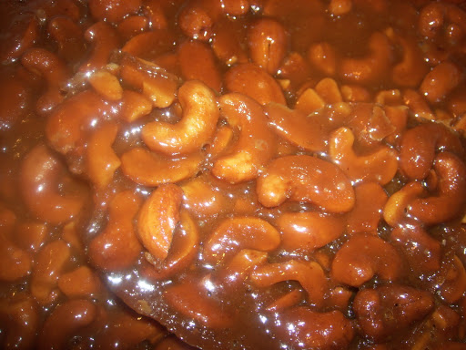 Remove from heat and add soda, salt and cashews. Quickly pour onto non-stick foil.