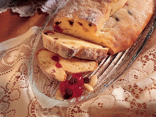 In medium bowl, mix powdered sugar and milk until smooth. Spread glaze over warm stollen.