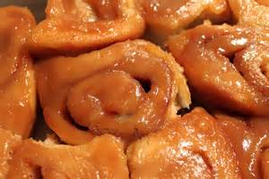 Tear a sheet of tin foil large enough to hold the rolls or use a cookie sheet, loosen the edge of the rolls with a sharp knife and flip the pan over onto the tin foil or cookie sheet. Use a spatula to scape up the remaining brown sugar caramel in the jelly roll pan and spread on the rolls, eat while hot!