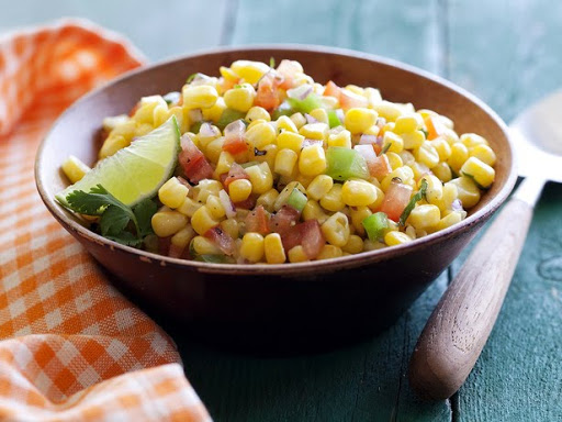Remove kernels with paring knife and place in large bowl. Add tomato, onion, and green pepper. Toss to combine. Add lime juice and olive oil. Snip in cilantro and season with salt and pepper. Serve