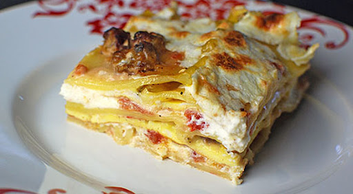 4. In the baking dish, start with a thin layer of sauce, followed by the first layer of noodles, then some more sauce and all three cheeses. Cook the first egg round for only a few minutes without flipping until it has just barely set on top. Transfer the egg to the top of the noodles then repeat with another layer of everything.