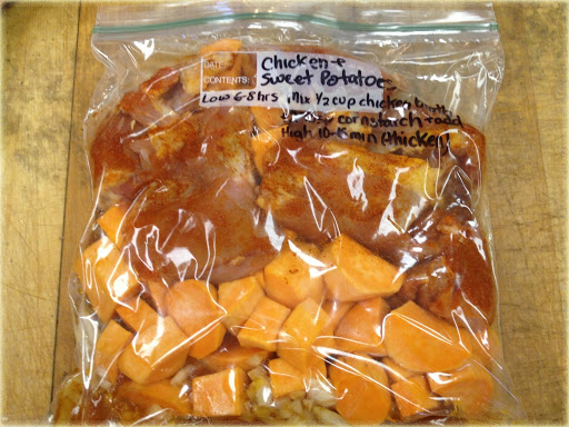 Sprinkle chicken with salt, cayenne pepper, paprika, curry powder, and ginger. Add peach preserves, vinegar, and soy sauce to gallon freezer bag. Add in sweet potatoes and onion, and top with chicken. Seal bag and place in freezer. When ready to use thaw in fridge overnight. Cover and cook on low for 6-8 hours until chicken is thoroughly cooked and sweet potatoes are tender when pierced with fork.