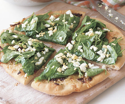-- While the pizza bakes, whisk together the vinegar, mustard, and olive oil; season with salt and pepper. When the edges of the crust are lightly browned and the cheese is bubbling, 10 to 12 minutes, return the pizza to the paddle or transfer it to a cutting board. Toss the spinach with the vinaigrette and pile it on the pizza. Sprinkle with the chopped egg, slice with a chef's knife, and serve immediately.