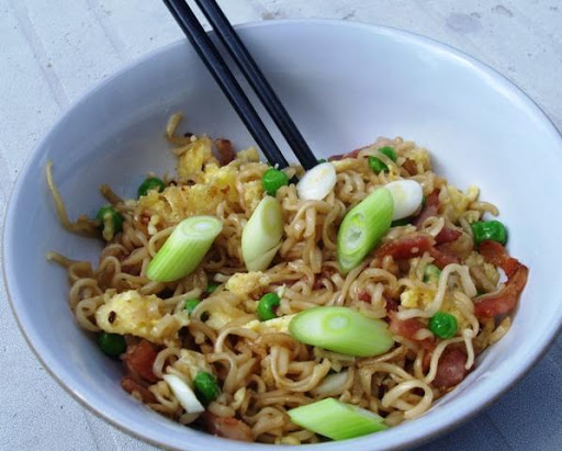 1 Break the noodles into about 6 pieces into a bowl, sprinkle with the contents of the seasoning packet and pour boiling water over to cover. 2 Stir a bit and let soak while you prepare the rest of the recipe. 3 Rinse peas with hot water in a colander to defrost. 4 Mix together the eggs, sesame oil, and pepper and set aside. 5 Heat a wok or large skillet and add the oil. 6 Add the garlic and green onions and stir-fry for 30 seconds. 7 Add optional meat and peas and stir fry until hot, about 1 minutes. 8 Drain the noodles well, add to the skillet and stir fry for another 2 minutes, stirring constantly. 9 Stir in the soy sauce until well distributed. 10 Pour the eggs into the skillet and continue to cook and stir, until the bits of egg are cooked. 11 Serve at once.