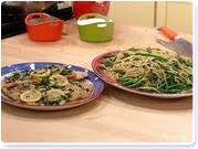 Chicken or Fish Piccata and Thin Spaghetti with Asparagus, Green Beans and Peas