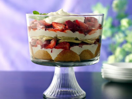 In 3 1/2-quart glass trifle bowl, arrange half the pancakes in bottom. Set aside 1 cup of the cream cheese mixture. Spoon half of the remaining cream cheese mixture over pancakes; top with half of the strawberry mixture. Repeat with remaining pancakes, cream cheese and strawberry mixture. Top with reserved 1 cup of cream cheese mixture. Garnish with additional berries and mint, if desired.