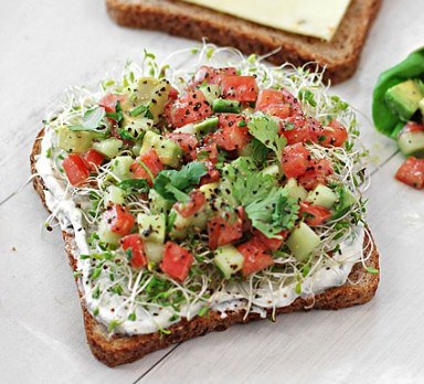 Spread the chive-yogurt mixture on all four bread slices. Divide the sprouts between two slices of bread, and top with avocado salad and cheese. Cover with the remaining slices of bread. (If using tortillas, spread the chive-yogurt mixture on the tortillas, and top with cheese, avocado salad and sprouts. Roll, and eat.) Makes 2 large sandwiches or 4 small wraps.