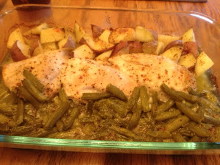 1. Place chicken breasts, new potatoes, green beans in a 9×13 dish. Sprinkle with a packet of Italian dressing mix and then top with a melted stick of butter.