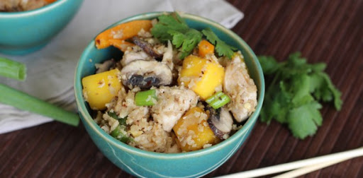 6. Once mushrooms and peppers are soft, add chicken mixture to the cauliflower rice and mix well.