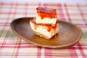 * Let the cheesecake sit out to cool for another 30 minutes to an hour, then slice into 24 squares while still warm. Refrigerate for a few hours to chill completely.