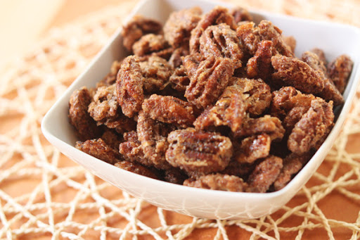 Spread pecans evenly over the lined cookie sheet and bake for 15 minutes. Mix and turn pecans with a fork and bake for an additional 15 minutes. Remove from the oven and allow to cool to room temperature. You may have to break apart some of the pecans, as they may be stuck together with additional sugar.
