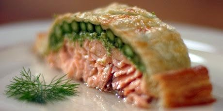 3. Lay the puff on a damp baking sheet with the long edge facing you. Lay the salmon on the pastry, like a picture in its frame. Season with salt and pepper. Lay the raw stems of asparagus on top of the salmon, like pencils. Spread the purée mixture over top.