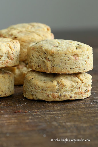 Bake in pre-heated 425 degrees F for 18-20 minutes until the tops just start to get golden. Remove the foil from top at the 17 minute mark, if you like the biscuits more golden and crisp, and bake without the foil for 2+ minutes. Remove biscuits from the oven and let cool for 2-3 minutes. Slice open and serve with vegan butter, gravy, soups. If you bake them for the entire time without the foil, the biscuits might appear hard on the outside, but they will be moist and soft on the inside.