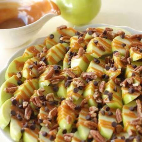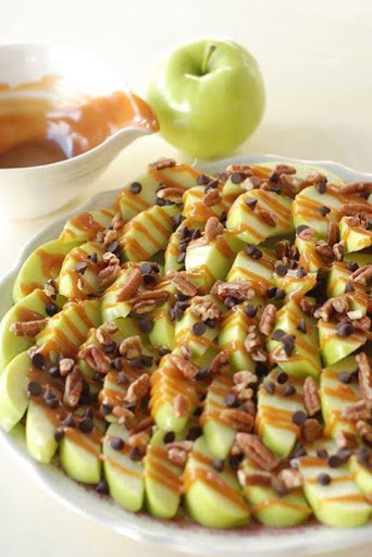 Green apple slices drizzled with caramel sauce and then sprinkled with mini chocolate chips and chopped walnuts.