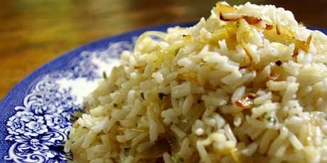 1. Heat the butter in a sauté pan and gently fry the onions until soft and slightly golden. Add the garlic one minute, along with the thyme. Season with salt and pepper and set aside. While the onions are cooking, bring a large pot of water to the boil. Salt it, as for pasta, then boil the rice until tender. Drain well. Toss with the onion mixture and heat through.