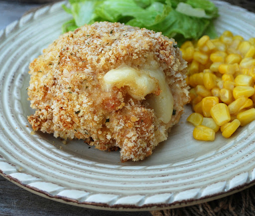 Roll each chicken breast in the beaten egg and then into the breadcrumbs. I like to use a combination of Italian crumbs and panko. Refrigerate for at least a half hour. This helps them to hold together a bit better. Place on parchment lined baking sheet and cook for 30 - 35 minutes on 350 or until golden brown. Let it rest for 5 minutes or so. This is stop the cheese from oozing out as soon as you cut into it. Remember to take out the toothpicks (or warn your guests) before eating!