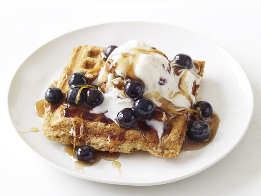 Simmer 1 cup blueberries, 1/2 cup maple syrup, 1/4 teaspoon vanilla and some lemon zest in a saucepan until slightly thickened. Toast whole-wheat waffles and top with scoops of butter-pecan ice cream. Drizzle with the blueberry sauce.