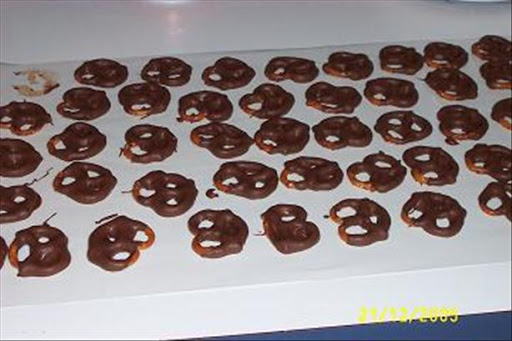 1 Pour melted butter over chocolate chips and microwave on high for two minutes. Stir until chocolate is creamy. 2 Dip pretzels in chocolate and coat well. Drain excess chocolate off of pretzels and place on a piece of wax paper. 3 Cool until chocolate hardens. Store in airtight container.