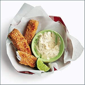 YIELD: 4 servings (serving size: about 3 fish sticks, 2 tablespoons sauce, and 1 lime wedge)