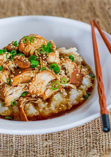 Shred the chicken with a couple forks and serve over hot cooked rice and spoon extra sauce if desired. Sprinkle with sesame seeds and serve with additional veggies if preferred.