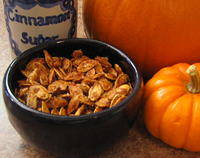 Rinse pumpkin seeds and pat dry; toss with butter, sugar and spices. Spread on a lightly greased baking sheet. Bake at 300 degrees for 45-60 minutes, turning occasionally, until crunchy and golden.