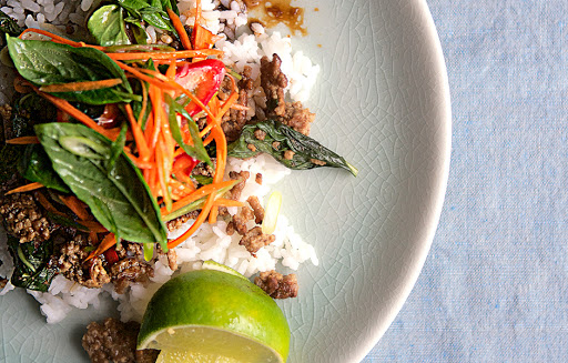 Toss carrots, scallions, 1 Tbsp. lime juice, and remaining chile, 1 cup basil leaves, and 1 Tbsp. oil in a small bowl.