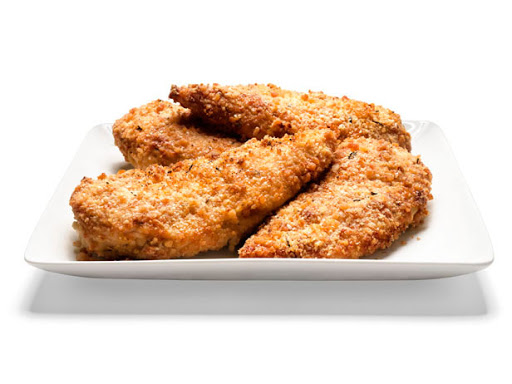 In a medium shallow bowl, combine the parmesan and panko. Dredge the chicken pieces in the panko mixture, coating evenly and heavily, and pressing the coating into the meat.