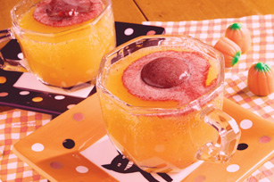 The blackberry sherbet looks like eyeballs floating in the orange punch. A perfect punch for a kid friendly Halloween party.