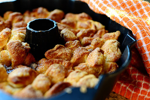 Open all the cans of biscuits and cut the biscuits into quarters. Fill a large Ziplock bag with the granulated sugar, the orange zest, and the dash of salt. Seal the bag and shake it around until the zest and the sugar are totally combined. Add the biscuit pieces to the bag, seal it and shake/toss it around until all the biscuit pieces are coated in the orange sugar. Pour the pieces into a bundt or tube pan and set it aside.