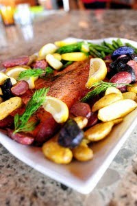Adjust oven racks to lowest and upper-middle position. Place potatoes on bottom rack and salmon on upper rack of cold oven, then heat oven to 400ºF. Roast until salmon is just opaque throughout, about 25 minutes, and potatoes are golden brown, about 30 minutes. Transfer salmon to a large platter; add asparagus to salmon roasting pan; continue to roast, along with potatoes, until bright green and just tender, 5 to 8 minutes, depending on thickness. Meanwhile, mix extra virgin olive oil, parsley, dill, capers and juice, scallions and lemon zest in a small bowl; set aside.