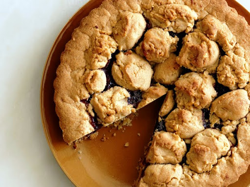 Press half of the dough into the prepared tart pan. Spread the jam over the dough, leaving a 1/2 -inch border around the edge. Drop about half of the remaining dough over the jam by the tablespoonful; lightly press the rest of the dough into the pan around the edge to form a crust. Bake until golden, 45 to 50 minutes.