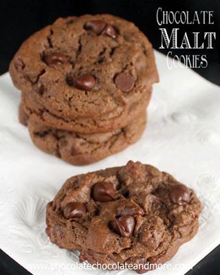 1.Cream butter and sugars together, about 2 minutes, until fluffy. Add in eggs and vanilla, beat again. Whisk together in a separate bowl, flour, baking soda, salt, cocoa and malted milk powder. Gradually add flour mixture to butter mixture blending till all combined. Stir in chocolate chips.